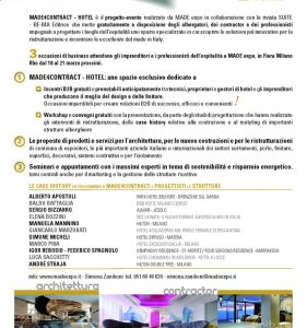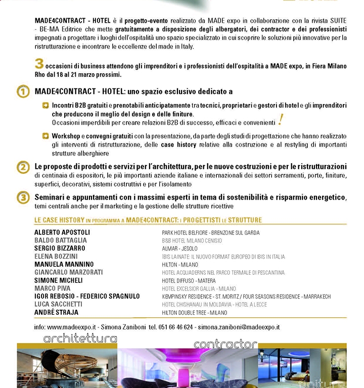 MADE4CONTRACT – HOTEL è il progetto-evento realizzato da MADE expo in collaborazione con la rivista SUITE che mette a disposizione degli albergatori, dei contractor e dei professionisti impegnati a progettare i luoghi dell’ospitalità, uno spazio specializzato in cui scoprire le soluzioni più innovative per la ristrutturazione e incontrare le eccellenze del made in Italy.