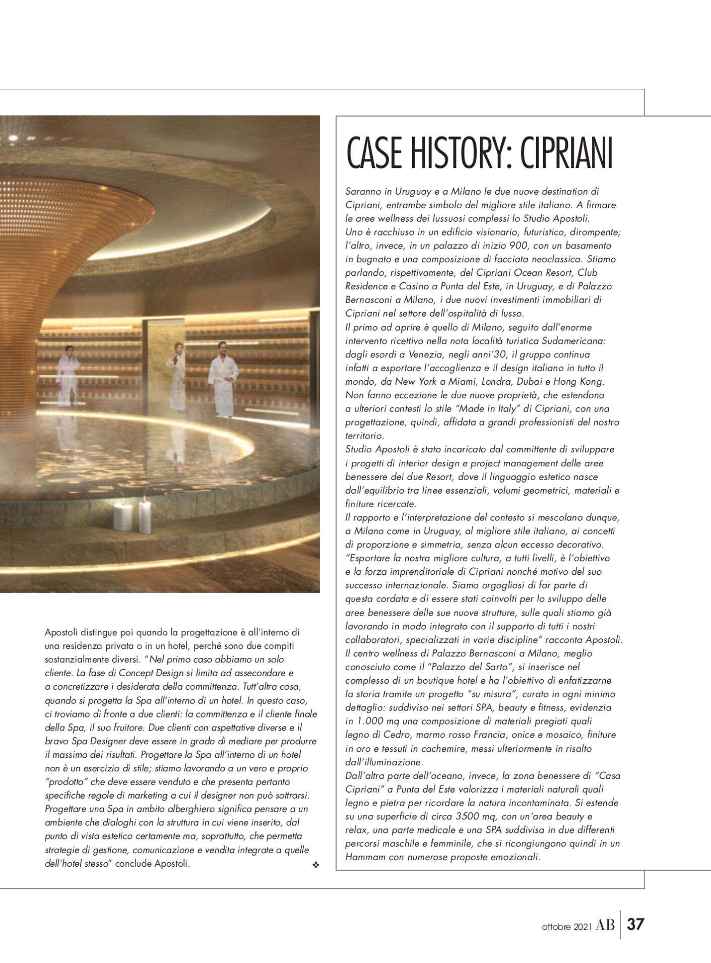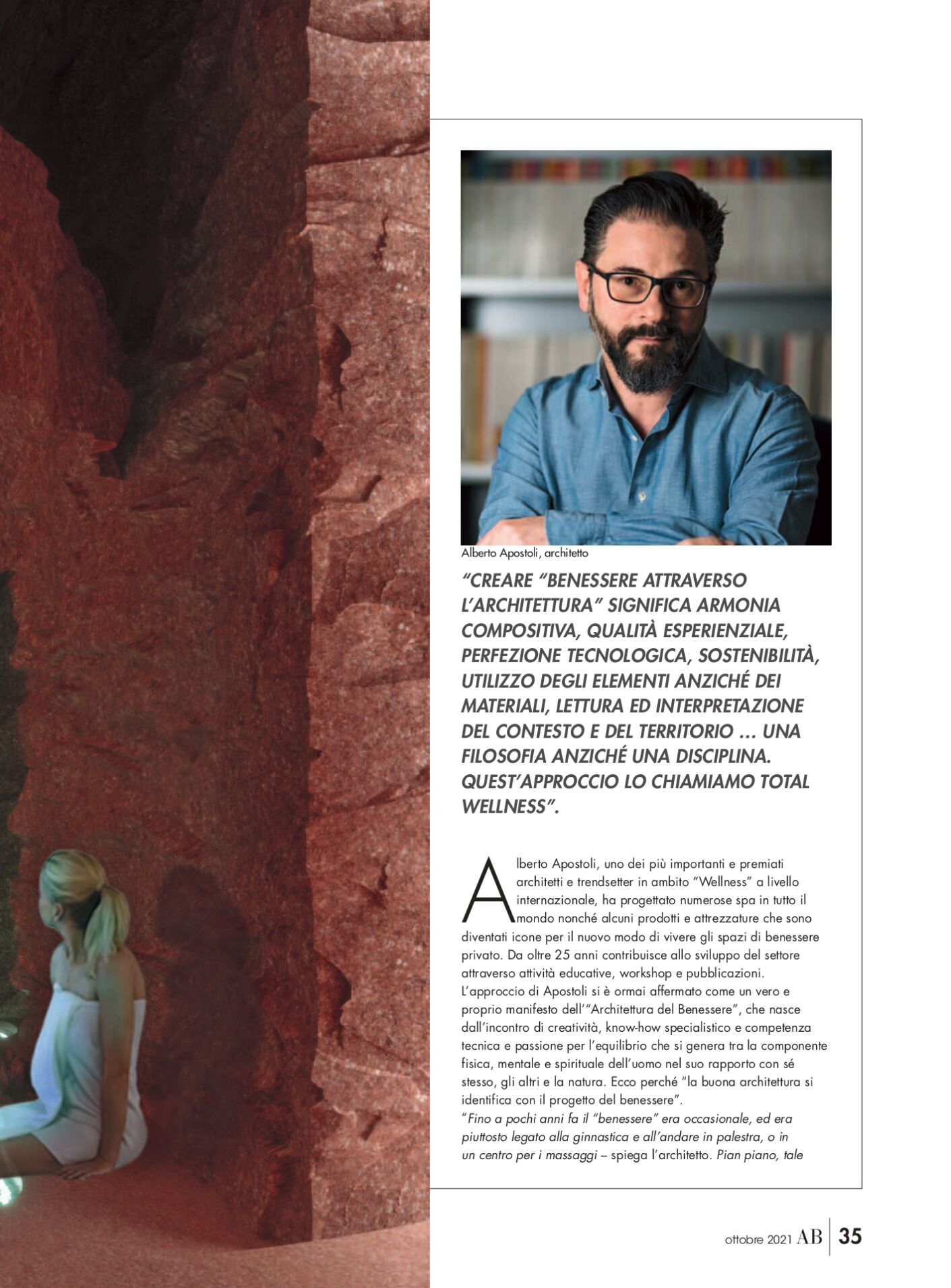 La rivista AB – Abitare il Bagno, diretta da Arianna Sorbara, ha incontrato l’Architetto Apostoli per un confronto sulla progettazione di ambienti dedicati al benessere.